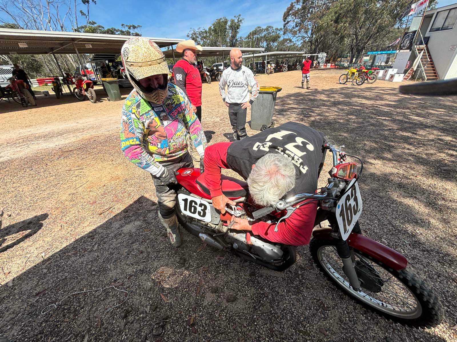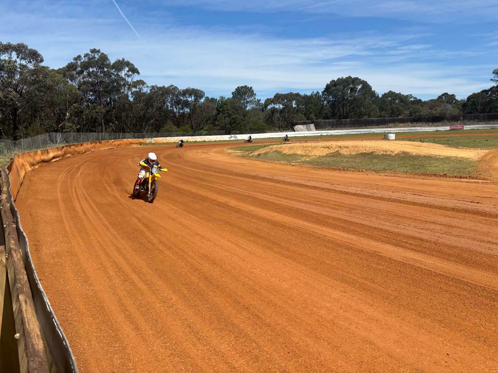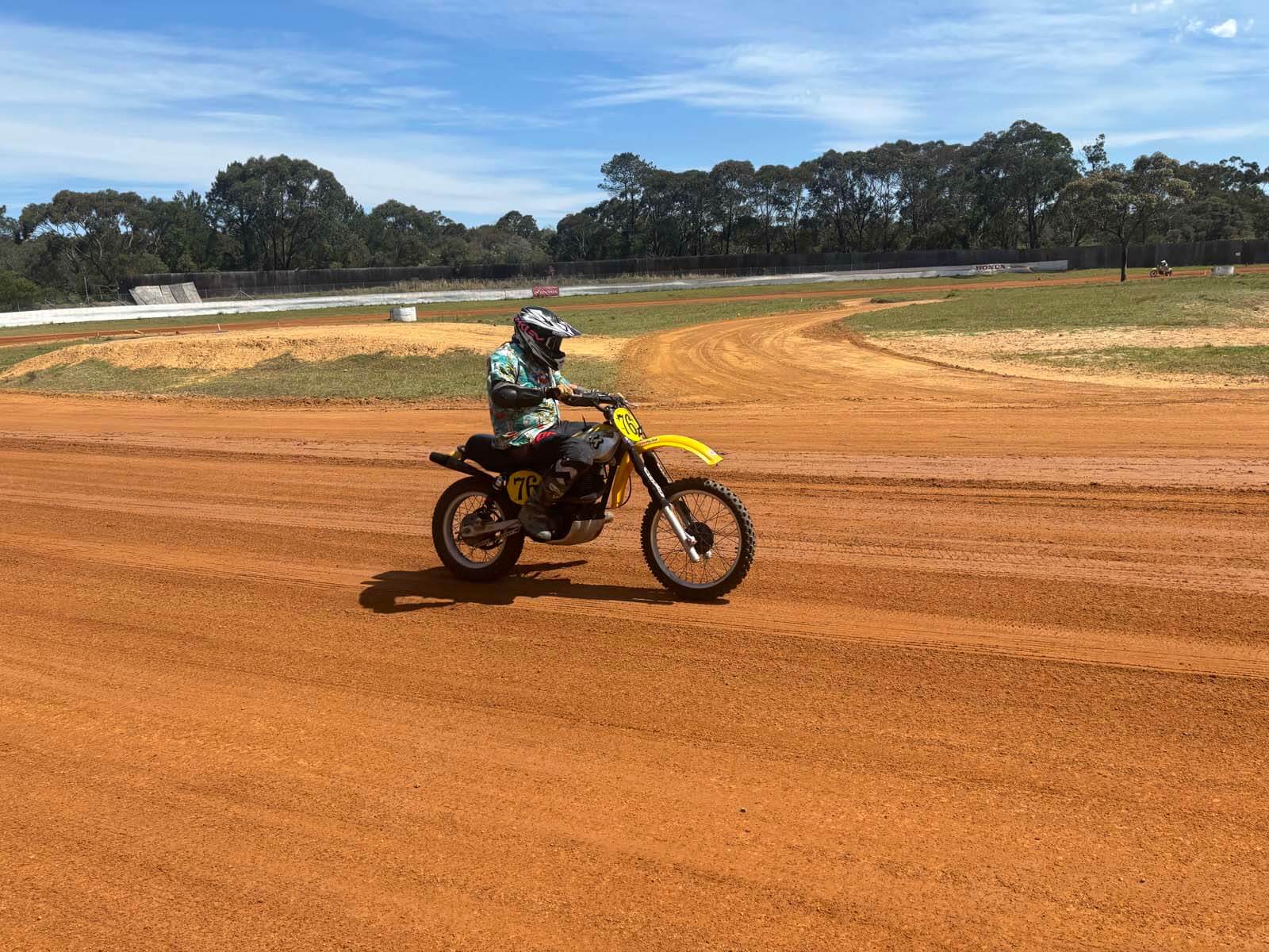 Sean's first race at Nepean dirt track in Western Sydney ended in a long walk back to the pits. The oversized 34mm carby did not want to deliver the right mix to the old chook chaser. And then the coil failed to provide a spark. Fortunately for Sean, the vintage dirt track community – aka the Jerkyls - gathered round, donated an emergency coil and Sean managed to ride a few laps. Slowly.