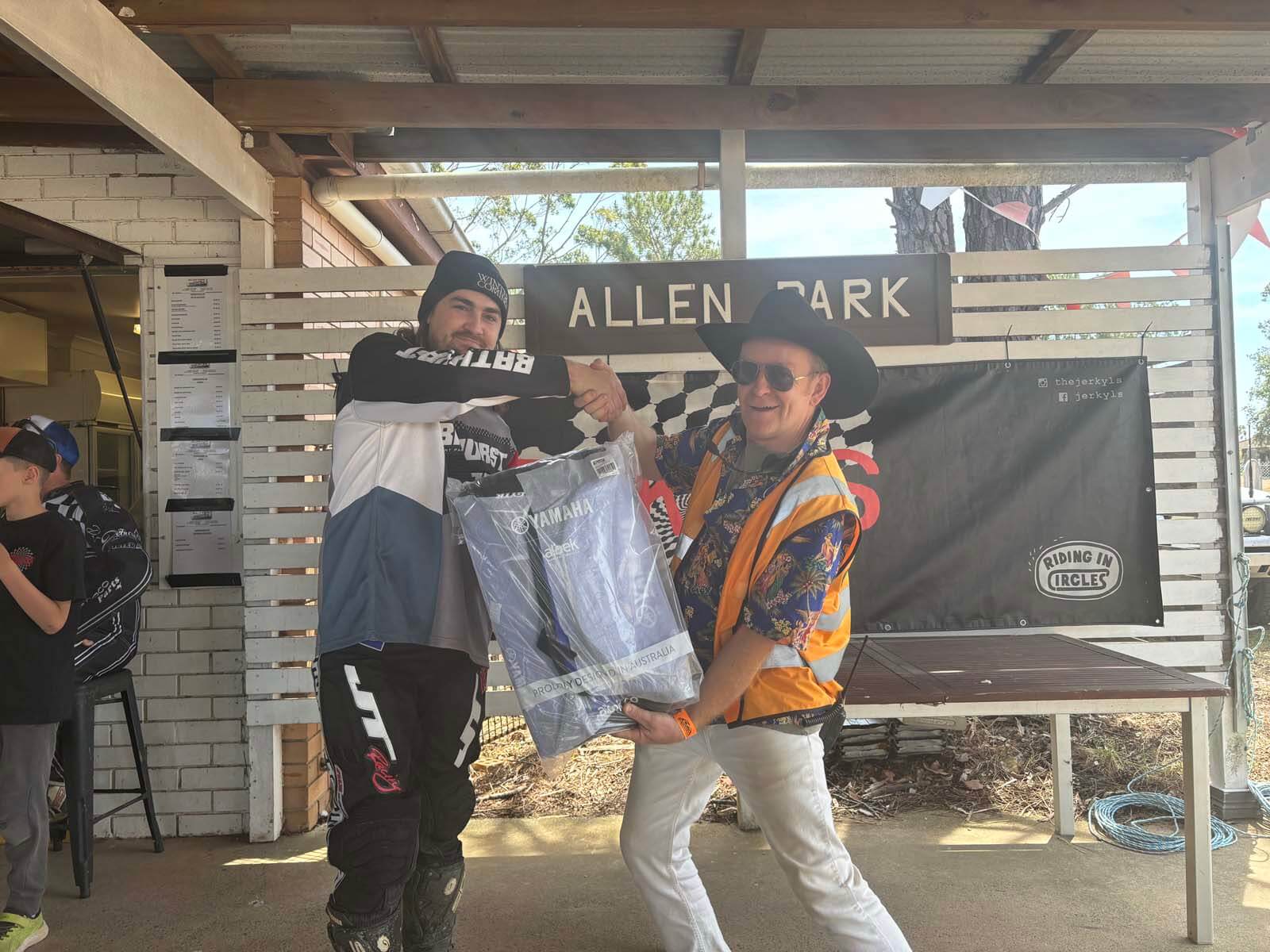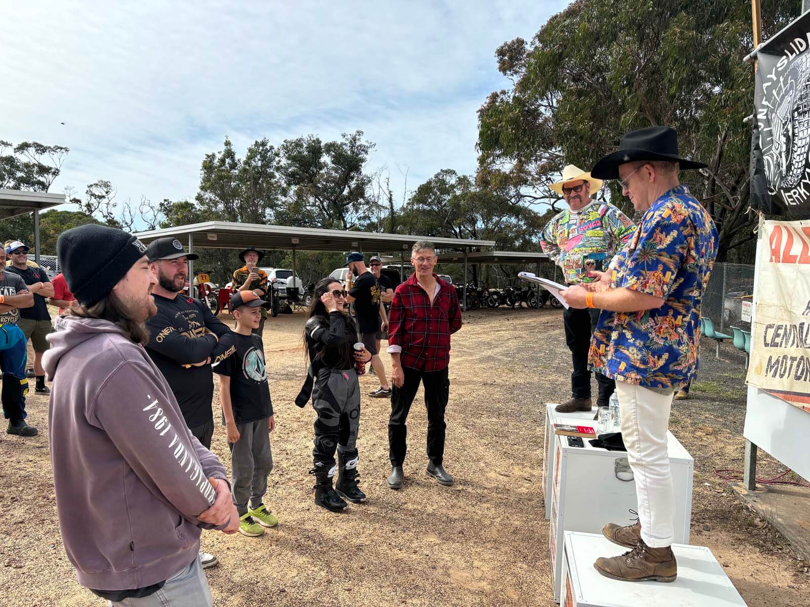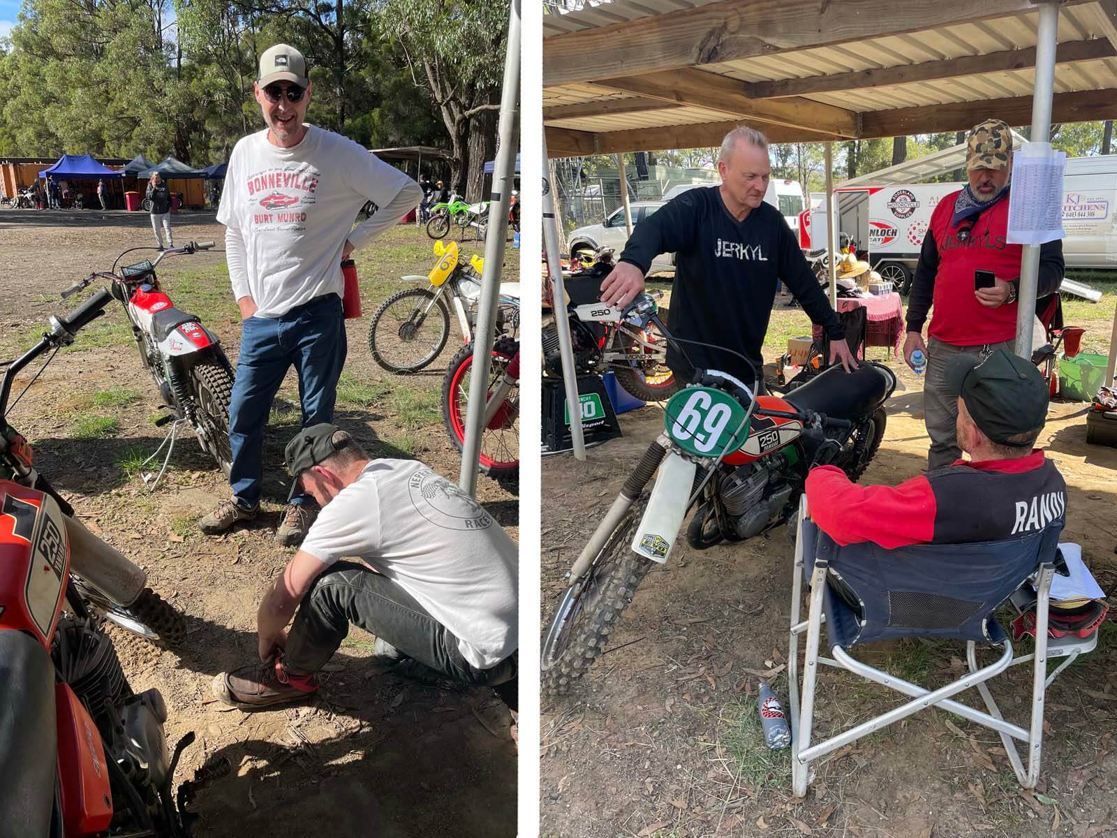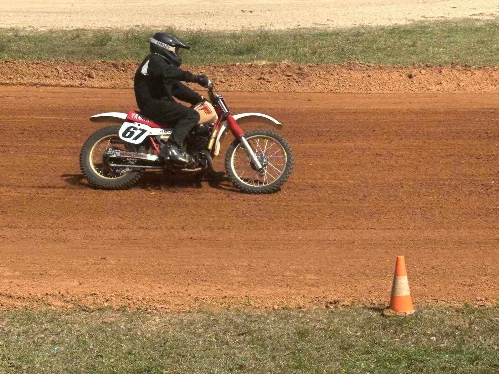 Sean's first race at Nepean dirt track in Western Sydney ended in a long walk back to the pits. The oversized 34mm carby did not want to deliver the right mix to the old chook chaser. And then the coil failed to provide a spark. Fortunately for Sean, the vintage dirt track community – aka the Jerkyls - gathered round, donated an emergency coil and Sean managed to ride a few laps. Slowly.