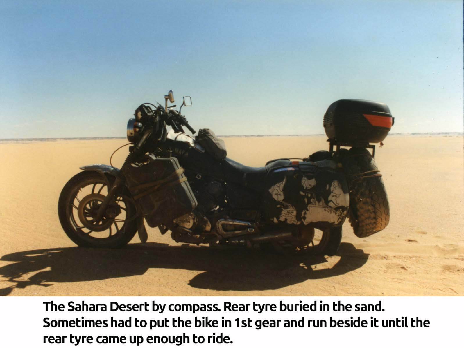 To reach her, Michael had to cross the Sahara Desert. "I travelled 800km by compass only—no track, no road markers. Massive sand dunes. The XV750 handled it all," he says. The following 4000km included just 400km of paved road. The rest was desert, bush, and jungle.