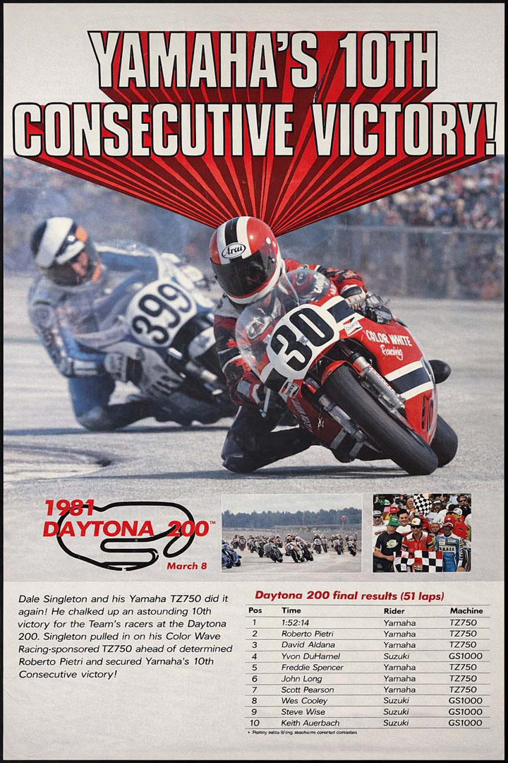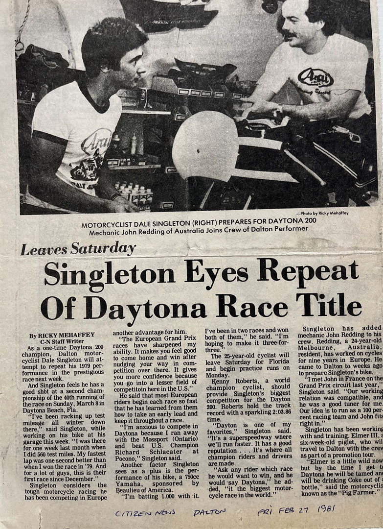 By late 1977, JR had moved to Australia and was working with the Victorian Yamaha importer and distributor, Milledge Yamaha, as State Service and Warranty Manager. It was a role that built on his technical credibility and sharpened his understanding of the whole system, from product support and customer expectations to the realities of keeping motorcycles performing exactly the way the factory intended. His work opened doors to hands-on racing roles as well as chief mechanic duties with Dale Singleton Racing International across the USA and Europe and other senior industry positions that demanded equal parts technical confidence and commercial judgement. During that period, JR was on the tools as Dale Singleton won the 1981 Daytona 200, a landmark result that also marked Yamaha’s 10th consecutive Daytona victory. It’s a reminder of how deep JR’s racing experience runs, more remarkable when you consider Yamaha Motor Co. was only 26 years old in 1981.