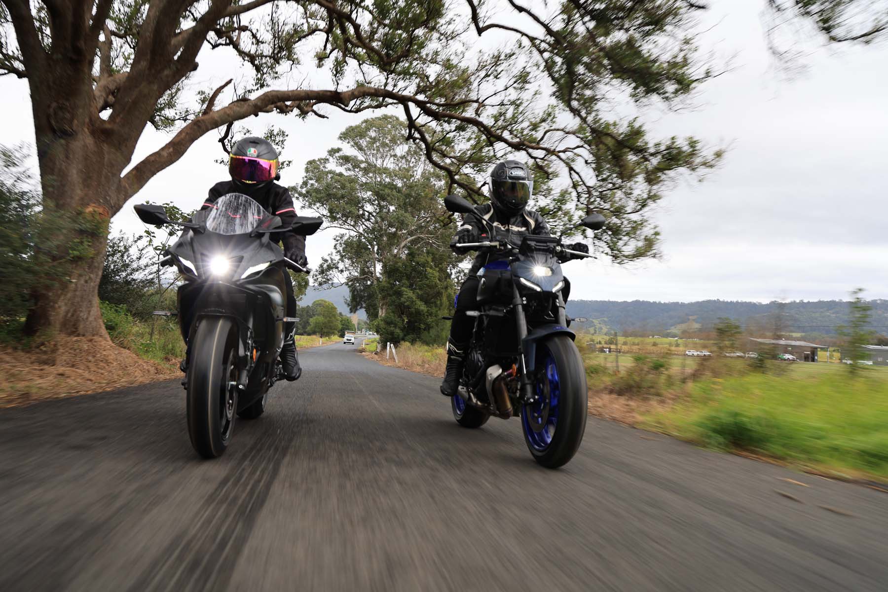 In contrast, Natasha, arrived at the meeting point riding a YZF-R7 Matt Black, captivated by its sporty intent, something she loved about here first motorcycle, a YZF-R3. "You’re so tucked in on the R7; it’s a much racier seating position," she explains. “The footpegs and seat are higher than the MT-07 providing a sporty forward-leaning stance to emphasise its racing heritage,” she adds, "It’s not uncomfortable, but you’re certainly slanted forward, and the fairing slices cleanly through the wind."