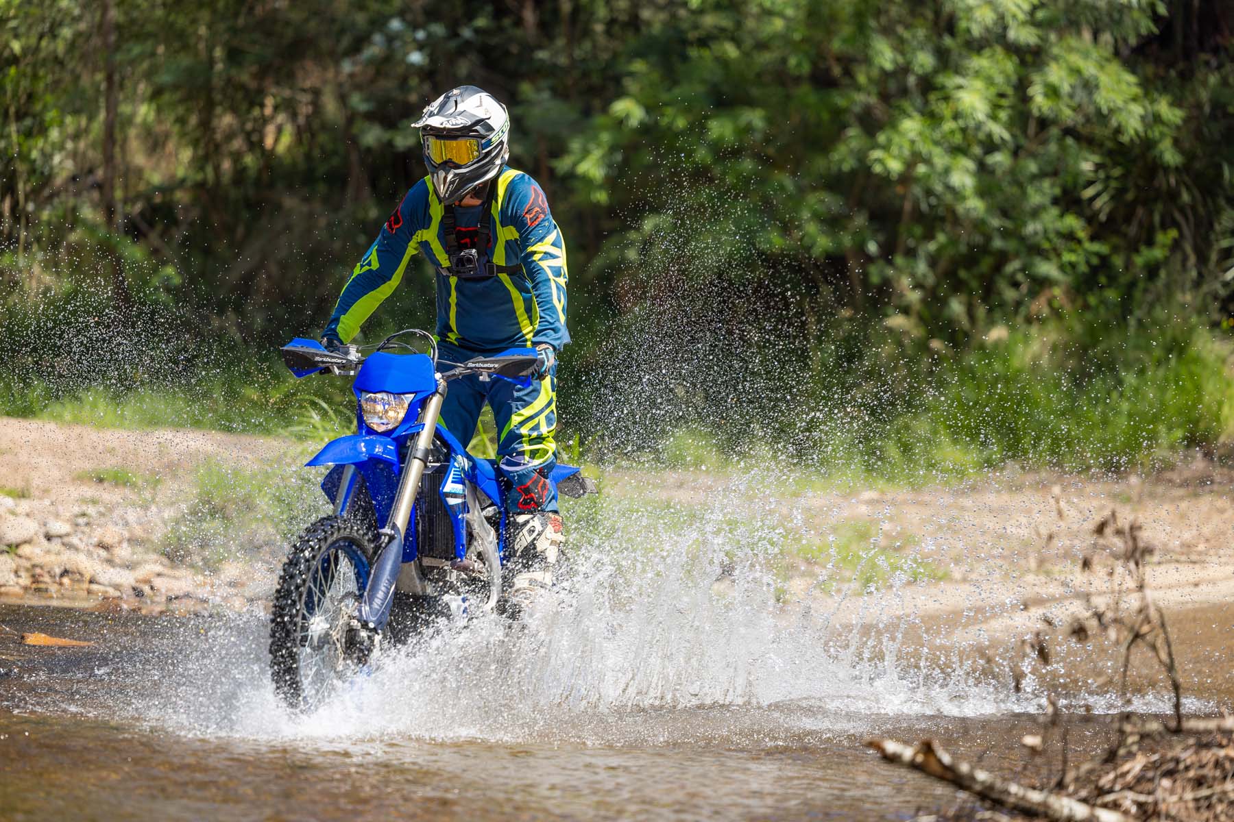 With 24 years of evolution and sharing an almost identical motor to its motorcross cousin the YZ250F, the WR absolutely screams. Yamaha rarely go year-to-year without updates to the motor, suspension, chassis etc – and it shows. The electric start fires up the fuel-injected DOHC motor with ease every time, although semi-reluctantly when in gear. The cable clutch is as smooth in its function as any hydraulic system, and the pull is every bit as light.