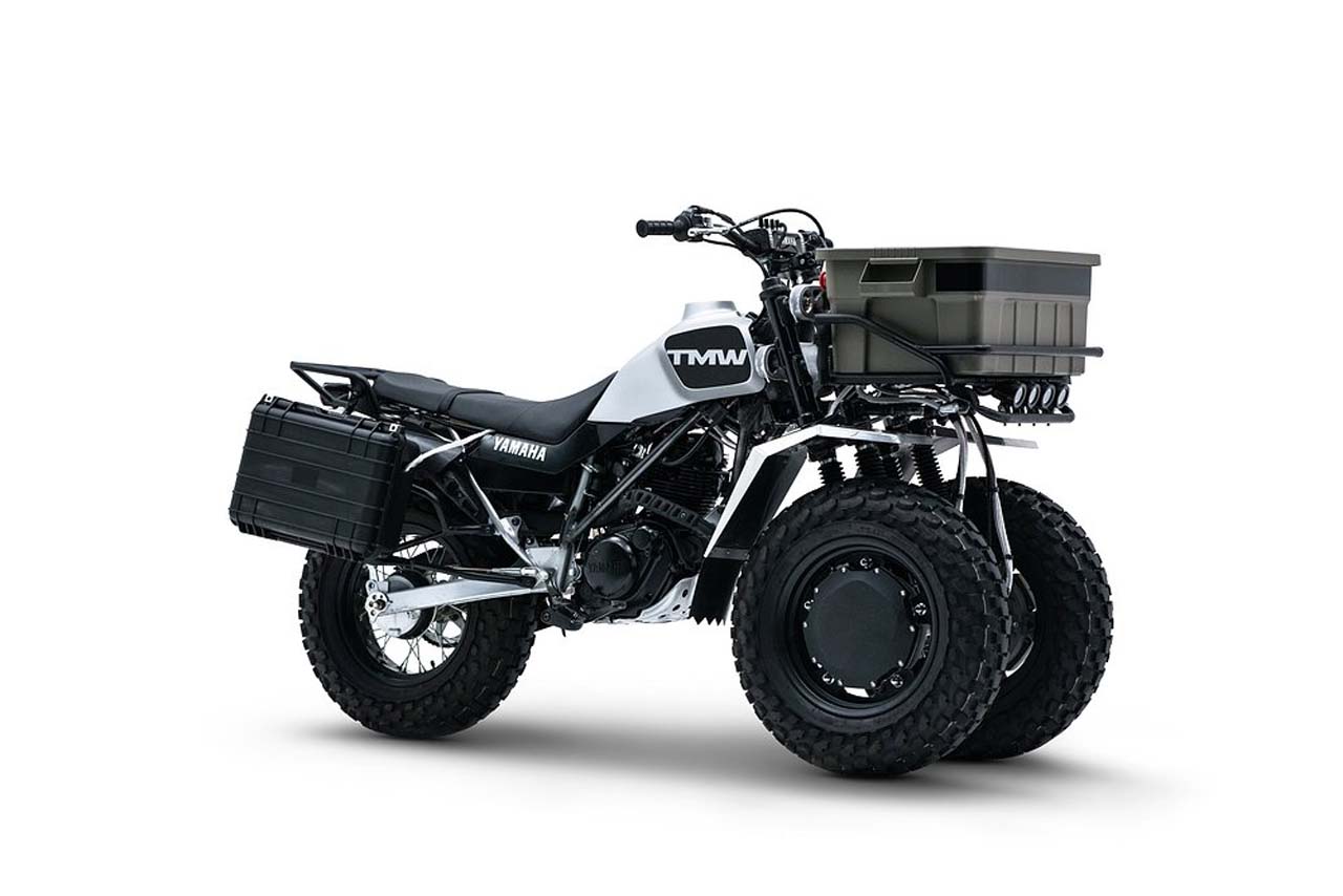 The TMW is Yamaha Motor's first off-road adventure Leaning Multi-Wheeler (LMW), conceived by volunteer project members from the Motorcycle Testing Division.* The front two wheels move independently and feature excellent adaptability for various surface conditions. The LMW linkage enables the mounting of a large front carrier rack that stays level with the ground even when in a lean or on an incline. This ample luggage capacity further entices users to venture out for a ride. The TMW is also a hybrid; electric hub motors drive the two front wheels, while the engine drives the rear wheel.