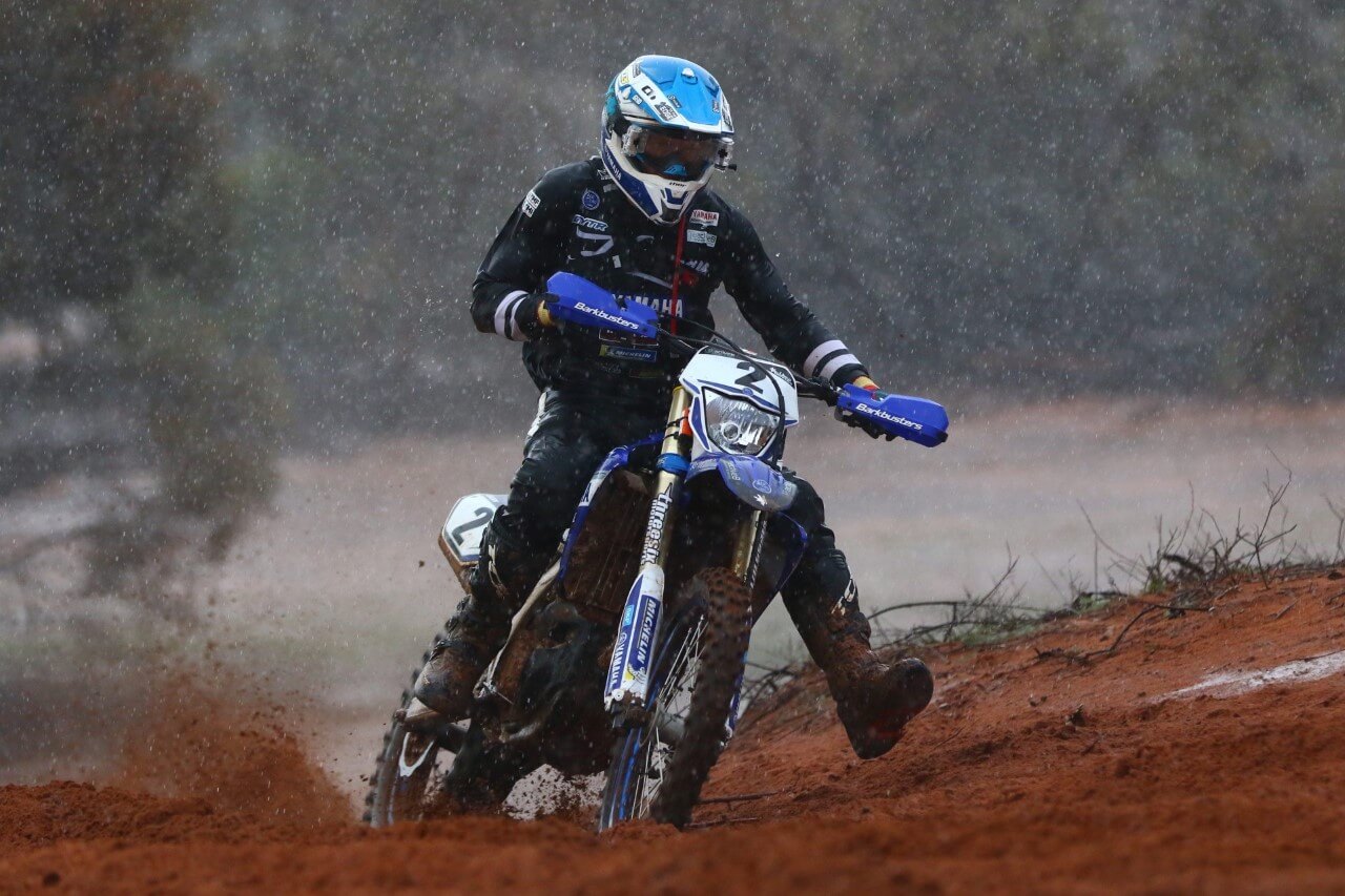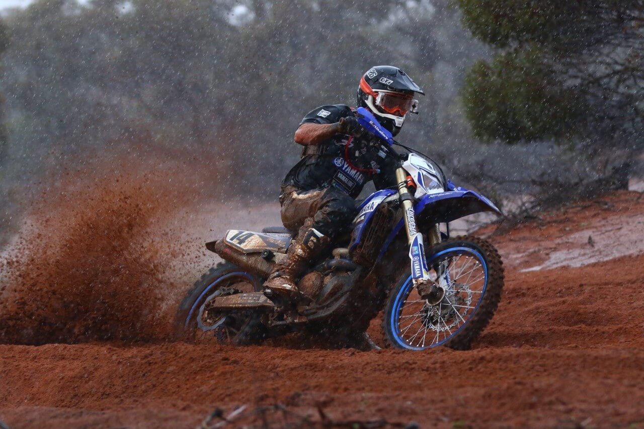 Driscoll took the win in the up to 250cc 4 stroke class on his WR250F after four gruelling laps of the Hattah course. The day started in perfect conditions, with the sandy racing surface moist and fast but all hell broke loose not long after the start when a massive cloud band moved over the area and dumped over 30mm of rain in 15minutes.It took the perfect course where lap times were around the 30 minute mark to a quagmire that left riders battling for survival more than a dirt bike race. With the rain continuing to fall, competitors unable to circulate and the medical team unable to move around the circuit, officials decided to shorten the race to just four laps, just half the usual distance.