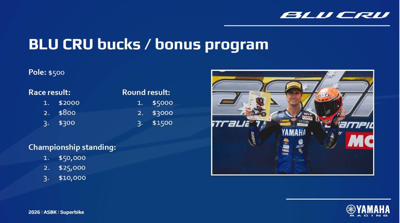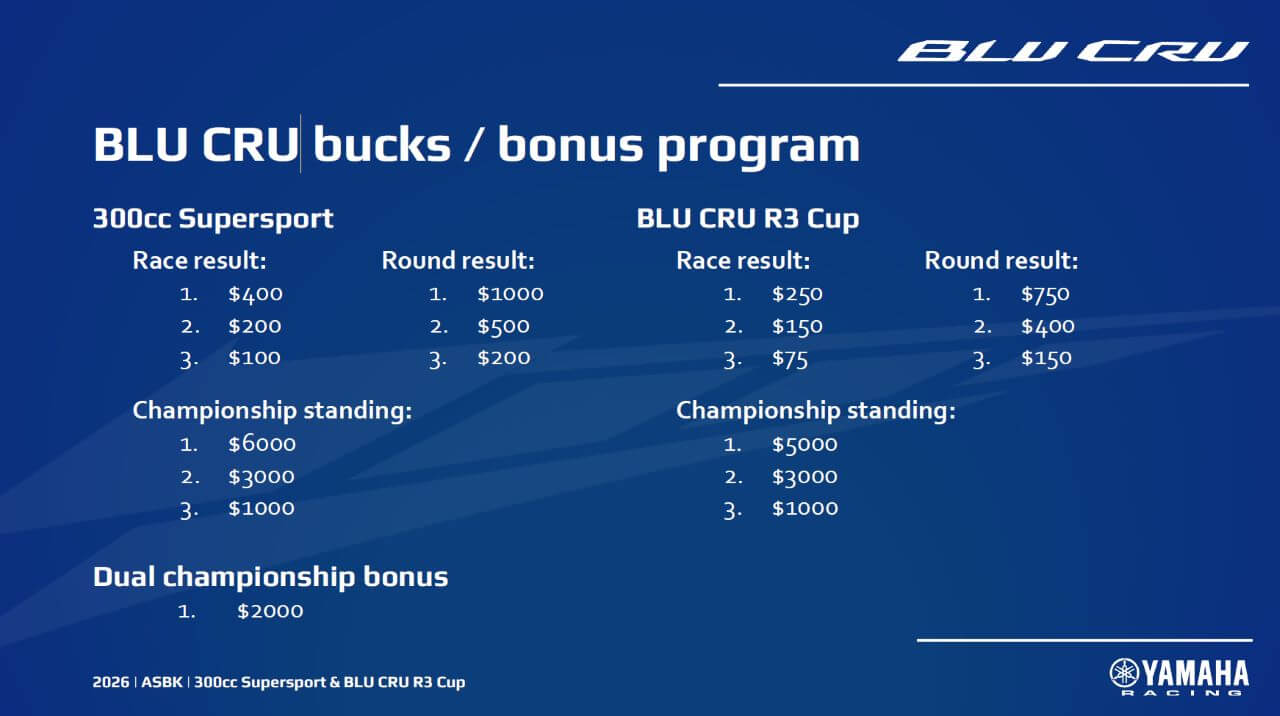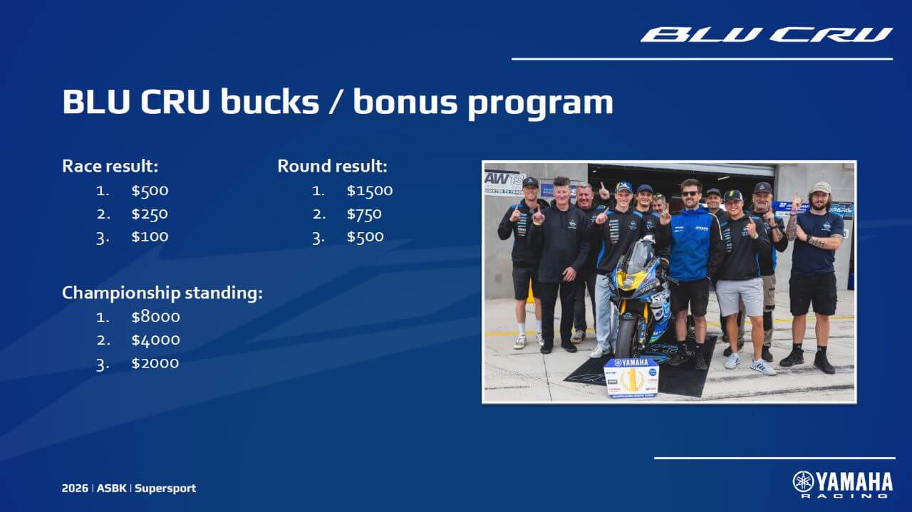 For the first time, Yamaha will make its bonus payments public and as long as you have entered on a Yamaha, run the approved Yamaha logos, race a Yamaha in all races for the that class and finish on the podium at the end of the round, Yamaha want you to be in the BLU CRU.